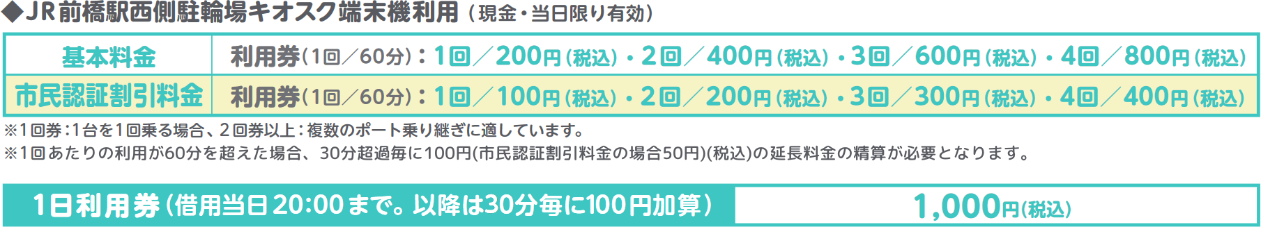 ※現金利用で追加発生した利用料金は、自転車返却後に「05 JR前橋駅西側駐輪場ポート」の路上端末機でお支払いください。
